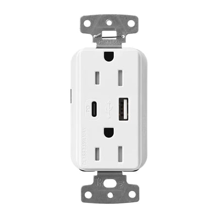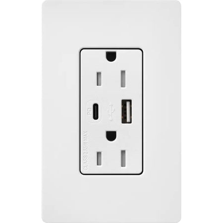 Coordinate your lighting controls with the Lutron Claro USB-C & USB-A Receptacle. This decorator-style 15A outlet eliminates bulky adapters while delivering industry-leading power. It features a dedicated USB-C Power Delivery (PD) port capable of 55W output—enough to charge laptops, tablets, and smartphones up to 70% faster than standard 5W chargers.