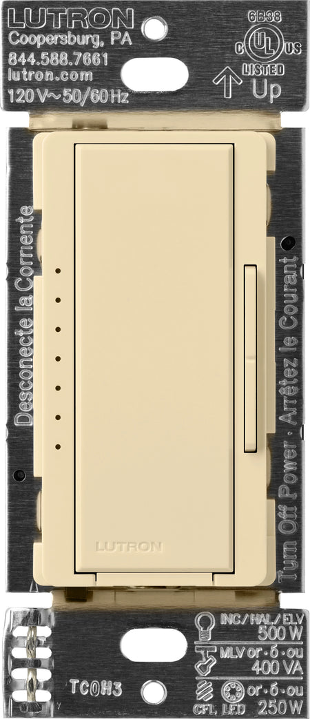 The Maestro PRO LED+ Neutral Optional Dimmer Switch features advanced phase selectable dimming, color change kits, and is designed for a broader compatibility range of high efficiency lighting. UL listed to control dimmable LEDs with integrated drivers, ELV, MLV, incandescent, and halogen loads as well as Phillips Mark 10 ballasts and Lutron Hi-Lume 1% 2-Wire (LTE) LED drivers. The large decorator style tap switch turns lights on/off and the dimming buttons allows for local fine-tune dimming. Works with up to 9 Maestro Companion Dimmer Switches (MA-R-xx) to create a multi-location dimming application. Neutral Optional. Screw terminal installation. Pairs perfectly with Lutron Claro wall plates for consistent color matching (sold separately).