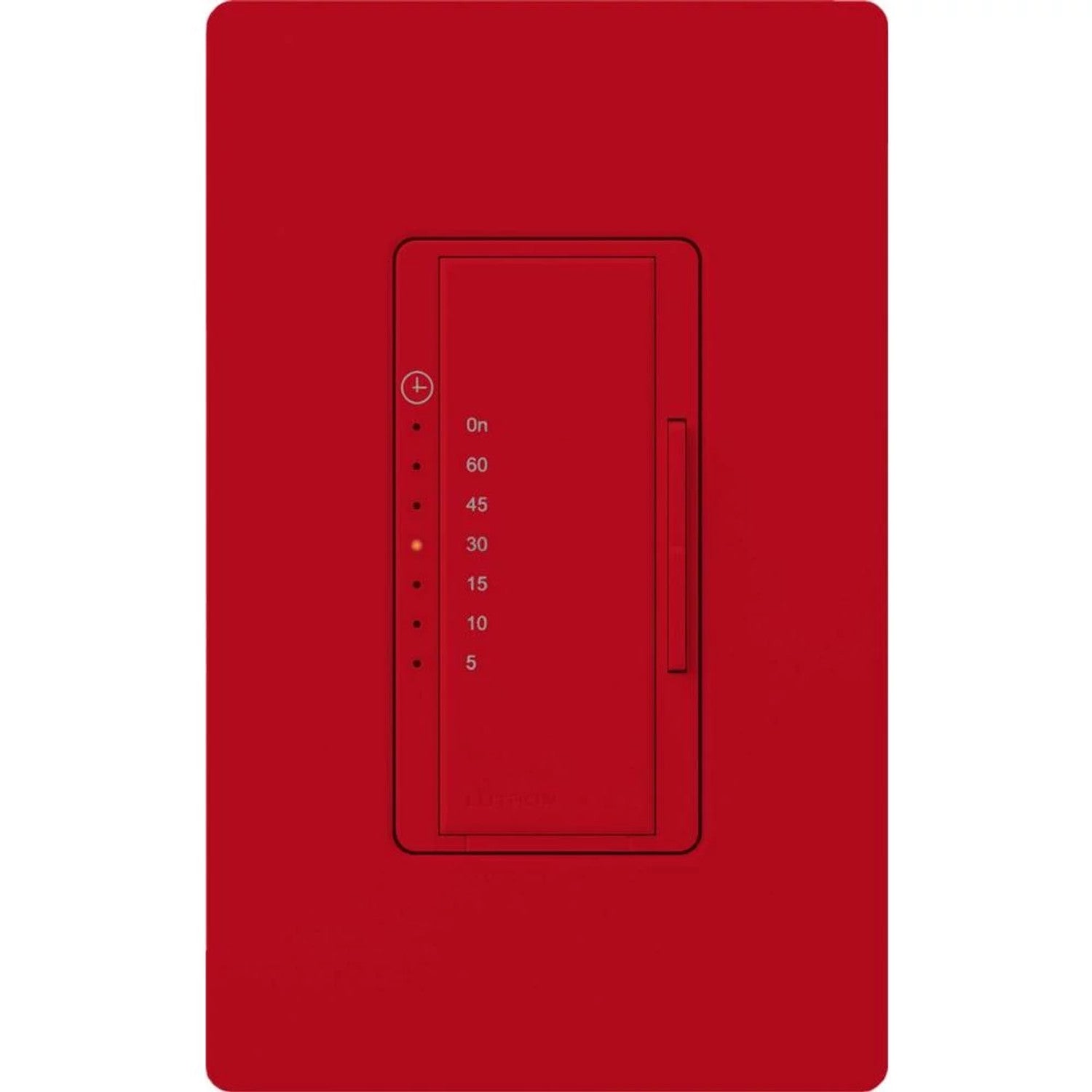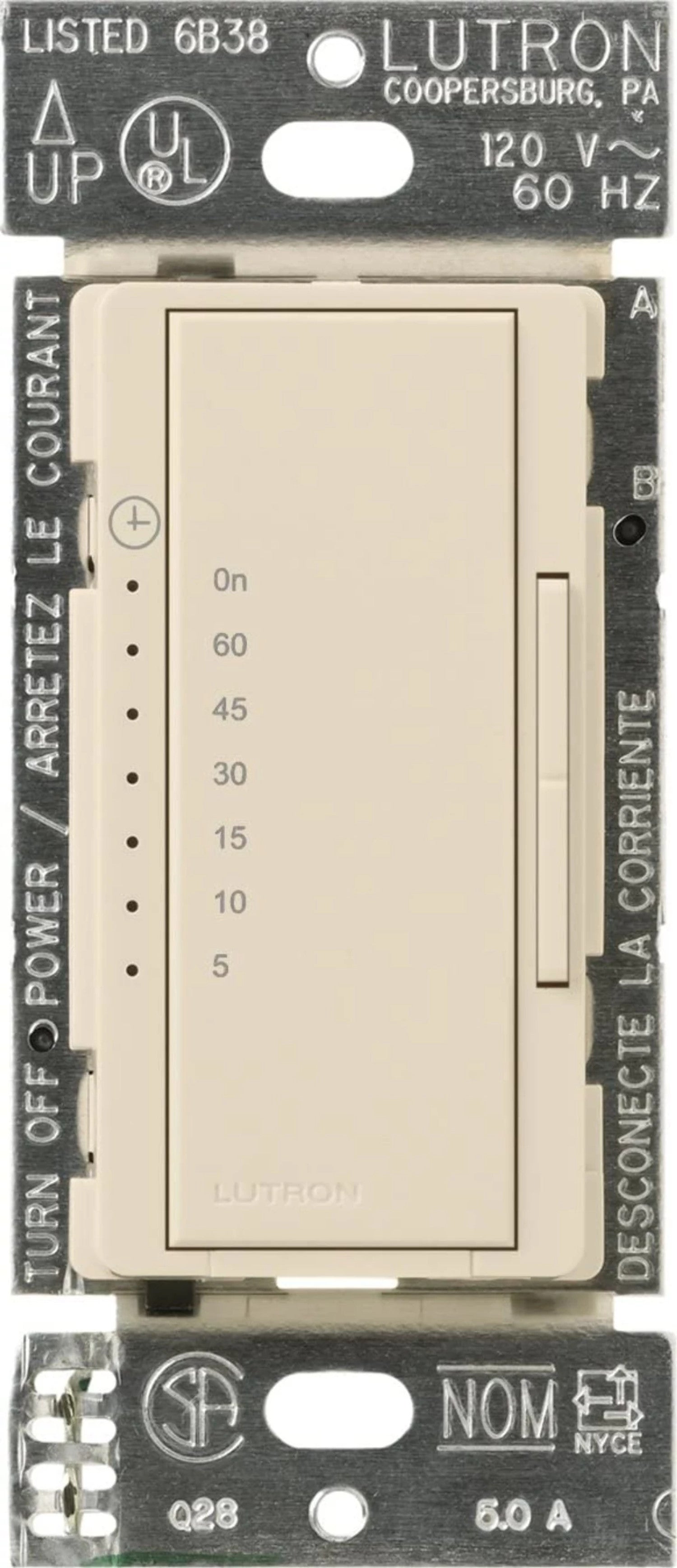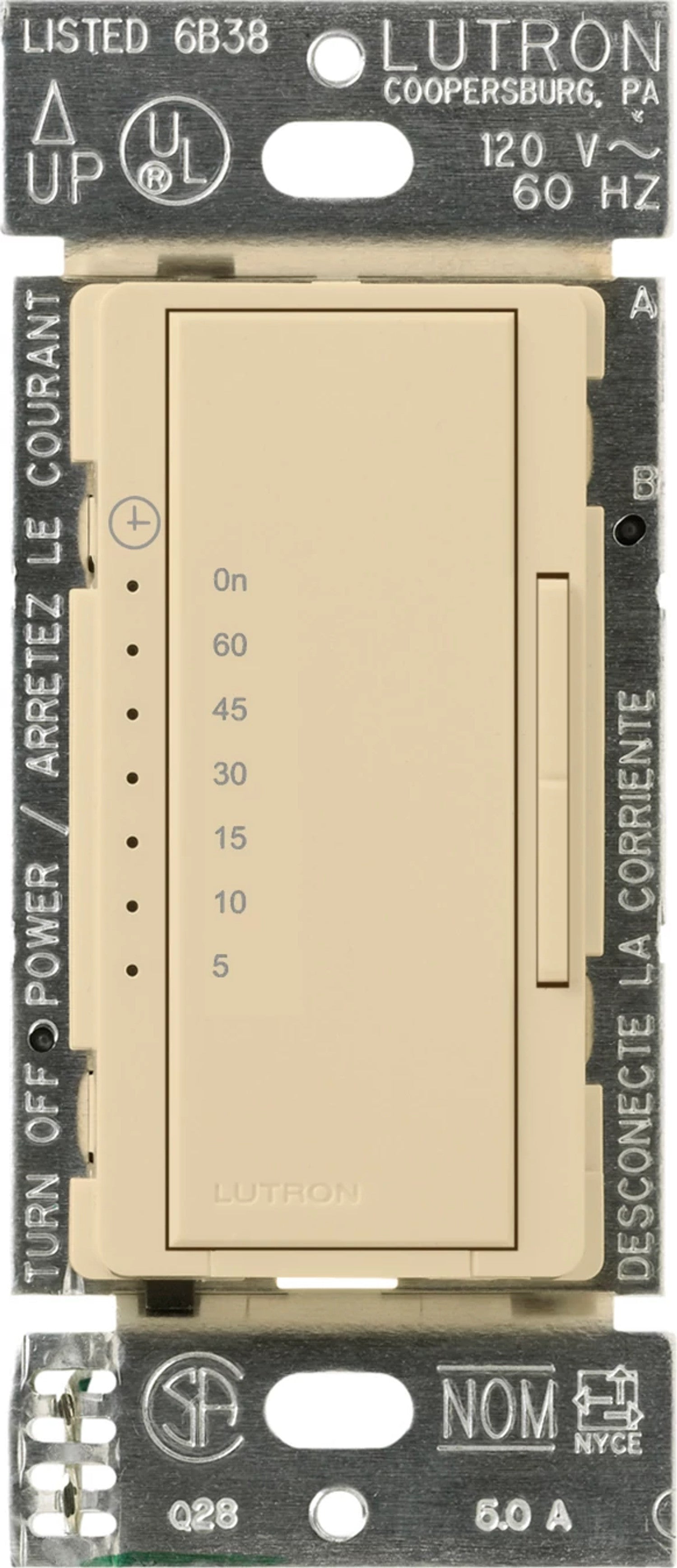 The Lutron Maestro Timer Switch for Fans and Lights is rated to work with up to 150W of LED bulbs, 600W ELV/Incandescent/Halogen, 450W MLV, or 3A general purpose fans. The Maestro Timer Switch requires a neutral wire making it suitable for DC and high efficiency exhaust fans. The Maestro Timer Switch is compatible with 3-way/multi-location switching applications; Lutron Accessory switches are required (MA-AS/MSC-AS). Use up to 9 Lutron Accessory switches with one Lutron Maestro Timer Switch; existing 3-way switches are not compatible. The Maestro Timer switch completes any project and matches the Maestro aesthetic for areas that don't’t require a Maestro dimmer or sensor. Save energy by using the Maestro Countdown Timer in closets, attics, bathrooms, and other low-traffic areas to ensure a light or fan is never left on for a long time. Use the large tap switch to turn the timer on, or double tap for always on; use the raise/lower buttons on the side to adjust to the desired time-out option ranging from 5-60 minutes. Softly lit orange lights indicate the time remaining before turn-off. Top green LED indicator light labeled ON, has no time limit. The bottom LED blinks rapidly to indicate one minute of time remaining. Available in 10+ colors. Pairs perfectly with Lutron Claro wall plates for consistent color matching (sold separately).
