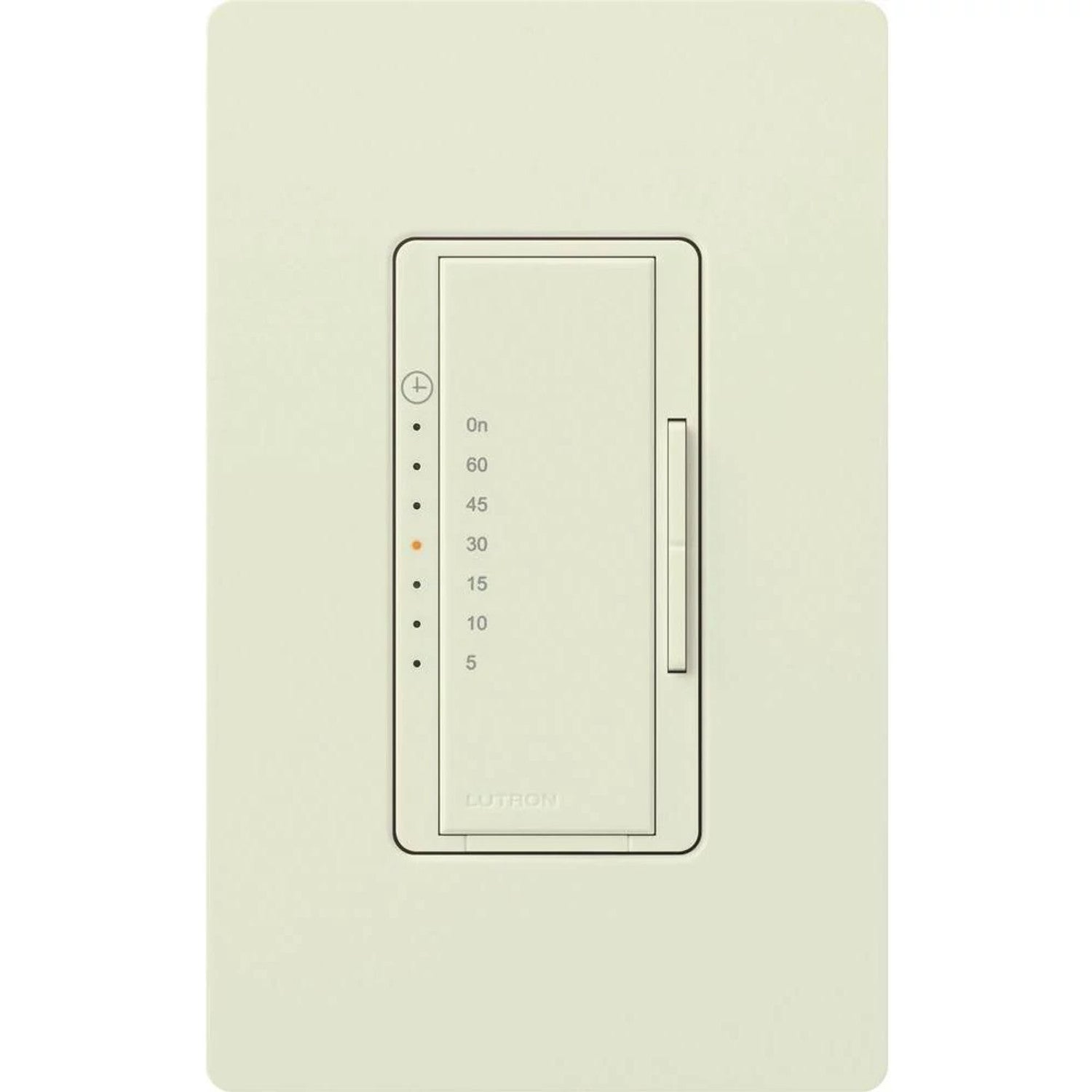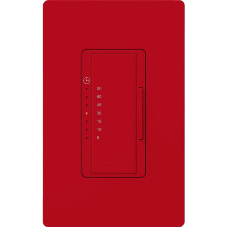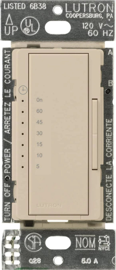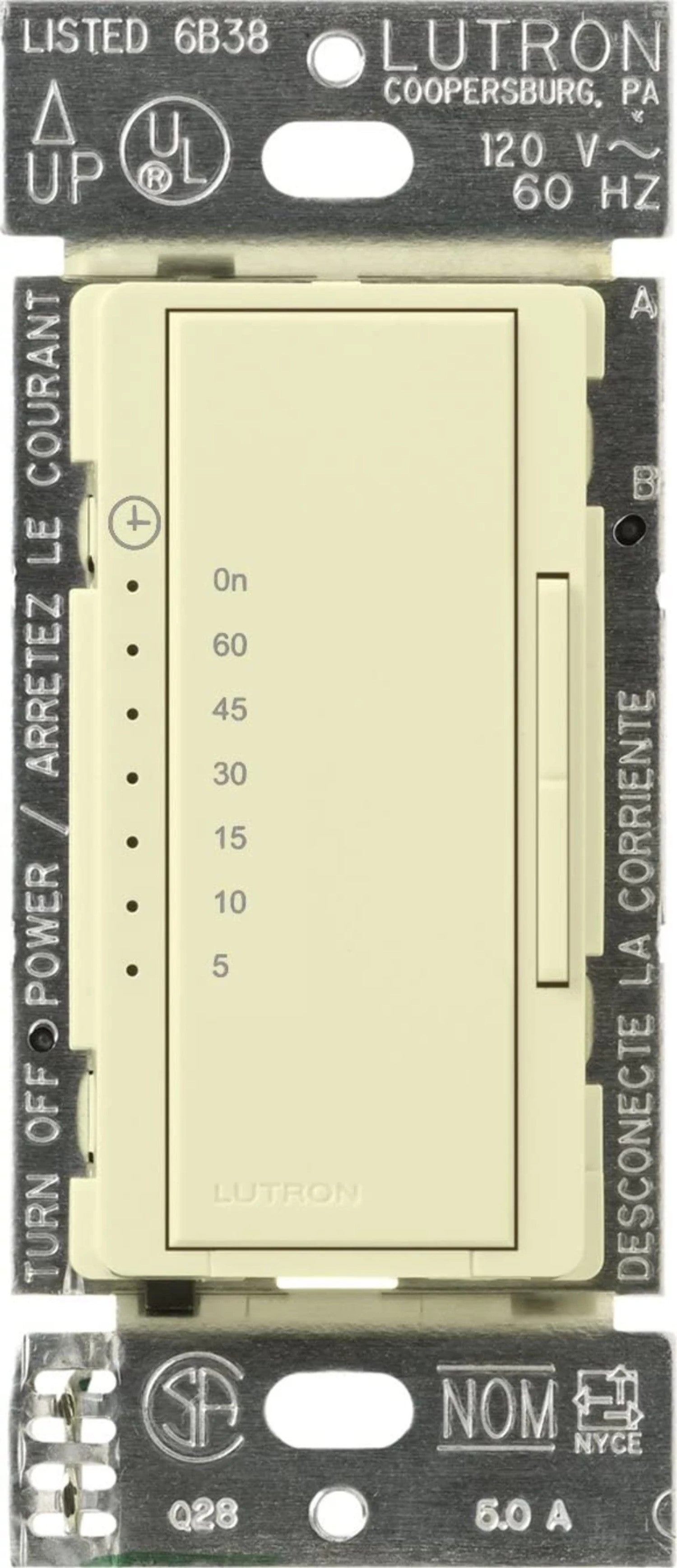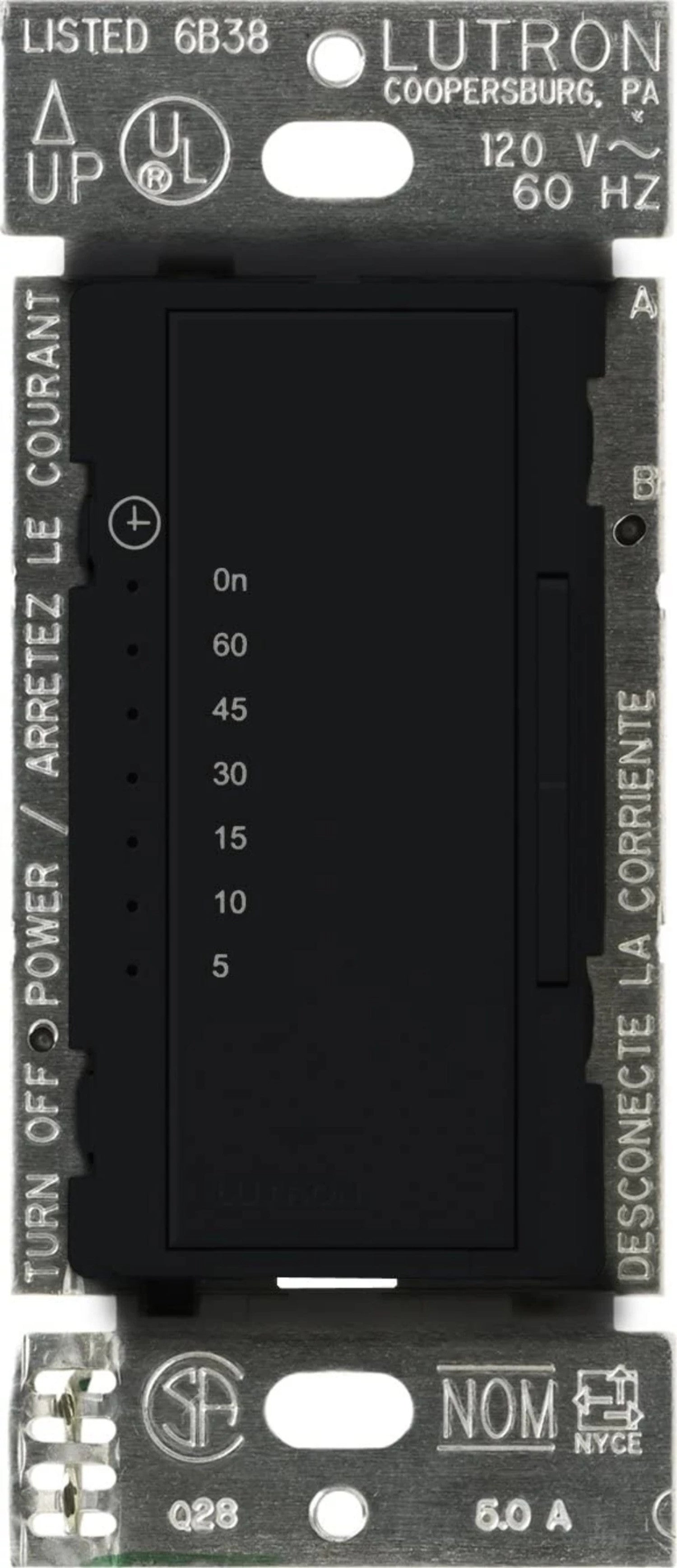 The Lutron Maestro Timer Switch for Fans and Lights is rated to work with up to 150W of LED bulbs, 600W ELV/Incandescent/Halogen, 450W MLV, or 3A general purpose fans. The Maestro Timer Switch requires a neutral wire making it suitable for DC and high efficiency exhaust fans. The Maestro Timer Switch is compatible with 3-way/multi-location switching applications; Lutron Accessory switches are required (MA-AS/MSC-AS). Use up to 9 Lutron Accessory switches with one Lutron Maestro Timer Switch; existing 3-way switches are not compatible. The Maestro Timer switch completes any project and matches the Maestro aesthetic for areas that don't’t require a Maestro dimmer or sensor. Save energy by using the Maestro Countdown Timer in closets, attics, bathrooms, and other low-traffic areas to ensure a light or fan is never left on for a long time. Use the large tap switch to turn the timer on, or double tap for always on; use the raise/lower buttons on the side to adjust to the desired time-out option ranging from 5-60 minutes. Softly lit orange lights indicate the time remaining before turn-off. Top green LED indicator light labeled ON, has no time limit. The bottom LED blinks rapidly to indicate one minute of time remaining. Available in 10+ colors. Pairs perfectly with Lutron Claro wall plates for consistent color matching (sold separately).