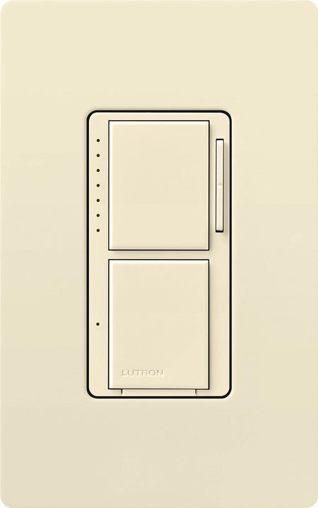 The Maestro LED+ dual dimmer and switch is a 2-in-1 control that incorporates an LED+ dimmer switch at the top and an on/off switch at the bottom. The Maestro LED+ dimmer works with up to 75 watts of LED bulbs, and the on/off switch is rated up to 2.5A for any bulb type or fans, including DC and high efficiency fans. This stacked control allows you to save space by combining two single pole loads into one control and helps avoid cutting additional holes in the wall. Just like Lutron’s other LED+ dimmers, this dual control uses existing wiring in any age home and does not require a neutral wire. The LED+ dimmer switch has an easy low-end trim adjustment for improved bulb performance and smooth, continual dimming. This dual stacked control is also equipped with myLevel Personalization, a simple button programming mode, which allows users to set their preferred brightness, fade on/off times, or disable the indicator lights. The dimmer’s seven green indicator lights brighten when the light is on, and correlate to the light level determined by the raise/lower buttons. When turned off, the indicator lights glow softly and serve as a locator in the dark. The easy-to-operate dimmer switch turns lights on and off to your favorite preset light level. Tap the dimmer switch twice for full on or press, hold, and release for a delayed fade-to-off, allowing for extra time to leave a room before the lights shut off. Tap the bottom switch to turn any light or fan on and off. A single green indicator light brightens when bottom switch load is on, and will remain softly lift when load is off. The Maestro LED+ dual dimmer and switch is ideal for places like bathrooms, under kitchen cabinets, or porch/entryways – making it a great replacement for stacked switches that aren’t rated for LEDs. Coordinates perfectly with Lutron Claro wall plates for consistent color matching (sold separately).