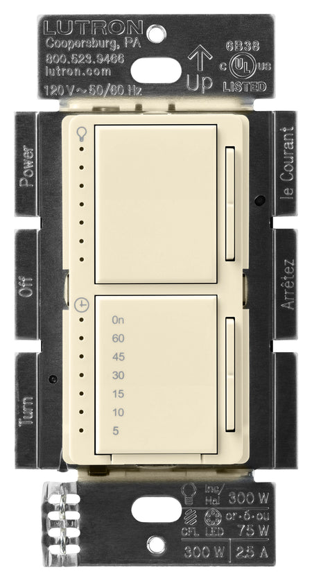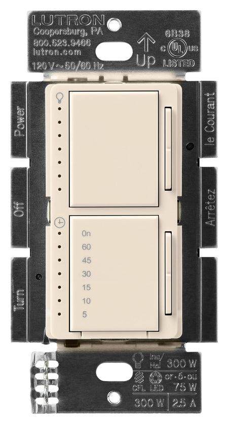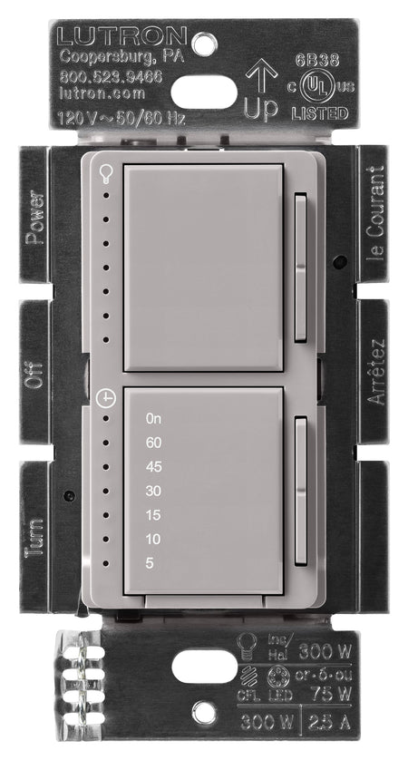The Maestro LED+ dual dimmer and timer is a 2-in1 control that incorporates an LED+ dimmer switch at the top and an on/off timer switch at the bottom. The Maestro LED+ dimmer works with up to 75 watts of LED bulbs, and the on/off timer is rated up to 2.5A for any bulb type or fan, including DC and high efficiency fans. This stacked control allows you to save space by combining two single pole circuits into one control and helps avoid cutting additional holes in the wall. Just like Lutron’s other LED+ dimmers, this dual control uses existing wiring in any age home and does not require a neutral wire. The LED+ dimmer switch has an easy low-end trim adjustment for improved bulb performance and smooth, continual dimming. This dual stacked control is also equipped with myLevel Personalization, a simple button programming mode, which allows users to set their preferred brightness, fade on/off times, or disable the indicator lights. The dimmer’s seven green indicator lights brighten when the light is on, and correlate to the light level determined by the raise/lower buttons. When turned off, the indicator lights glow softly and serve as a locator in the dark. The easy-to-operate tap switch turns lights on and off to your favorite preset light level. Tap the dimmer switch twice for full on or press, hold, and release for a delayed fade-to-off, allowing for extra time to leave a room before the lights shut off. Tap the timer switch to turn the timer on and off and use the raise and lower buttons on the side to increase or decrease the time – anywhere from 5-60 minutes. When setting the time duration, the indicator lights are solid orange, and remaining time is indicated by a flashing orange; the top green indicator light labeled “On” has no time limit. The Maestro LED+ dual dimmer and timer is ideal for places like bathrooms and is a great replacement for stacked switches that aren’t rated for LEDs. Coordinates perfectly with Lutron Claro wall plates for consistent color matching (sold separately).