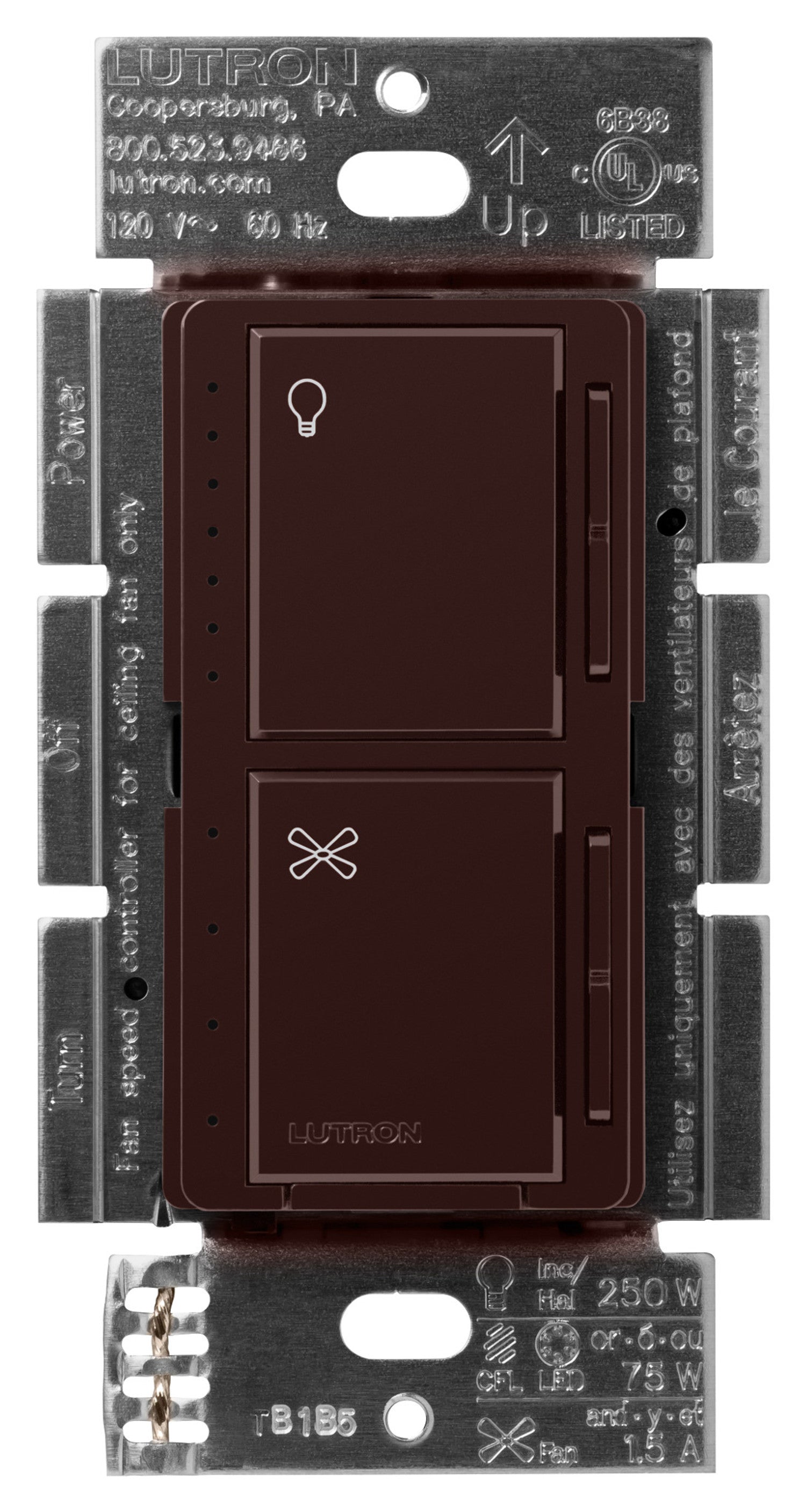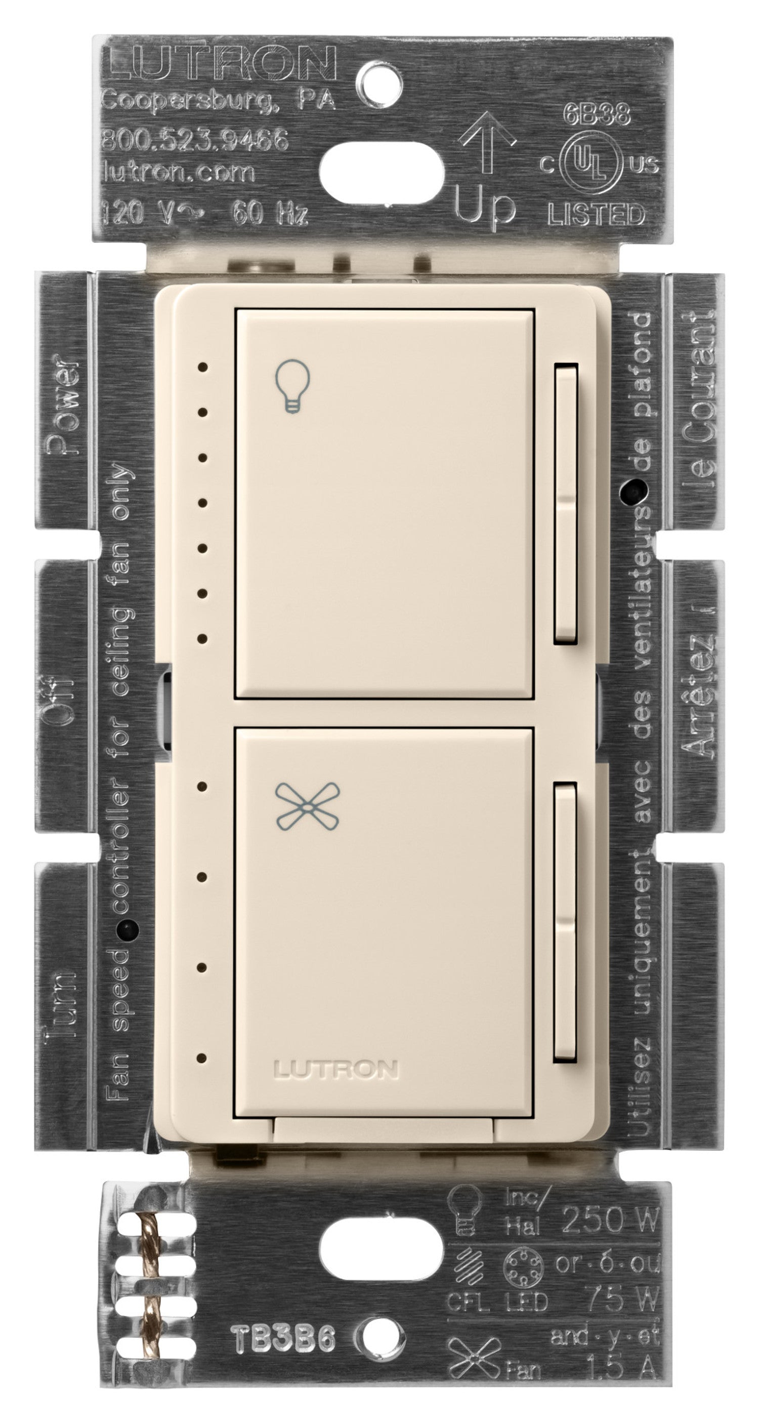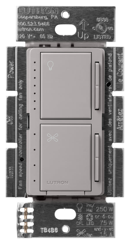 The Lutron Maestro Dual LED+ Dimmer and 4-Speed Fan Control helps you achieve the ideal comfort level for your home. It includes the most advanced technology for superior dimming and adjust the fan speed all from one wall control. The top section is a LED+ Dimmer that works with up to 75W of dimmable LEDs or up to 250W of Incandescent/Halogen bulbs. The bottom section is a 4-speed fan control for a single ceiling paddle fan up to 1.5A. Press the tap switch once to toggle the light or fan ON to a programmed preset, press again to toggle OFF; Double press the tap switch to turn light or fan ON to full intensity/speed. Use the raise/lower button next to the tap switch to dim/brighten lights or increase/decrease fan speed. This Fan/Light control is only available in single pole. Screw terminal and wire lead installation. No neutral or canopy module required. LED+ dimmer portion has easy low-end trim programming. Available in 10+ colors. Pairs perfectly with Lutron Claro wall plates for consistent color matching (sold separately).