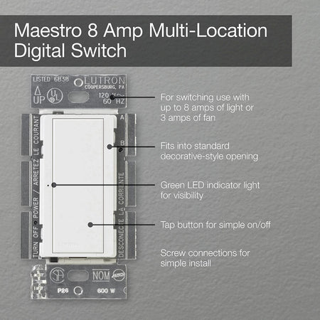 The Lutron Maestro 8A Electronic Switch is rated to work with up to 8A of lighting loads, or 3A general purpose fans. The Maestro 8A Switch requires a neutral and is compatible with multi-location switching applications; Lutron Accessory switches are required (MA-AS/MSC-AS). Use up to 9 Lutron Accessory switches with one Lutron Maestro Electronic Switch; existing 3-way switch are not compatible. The Maestro Companion switches sync with the programming of the main Maestro Switch. The Maestro 8A switch completes any project and matches the Maestro aesthetic for areas that don’t require a Maestro dimmer or sensor. Press anywhere on the tap switch to toggle between ON/OFF. A soft green LED indicator light glows when load is OFF and brighten when load is ON. Available in 10+ colors. Pairs perfectly with Lutron Claro wall plates for consistent color matching (sold separately).