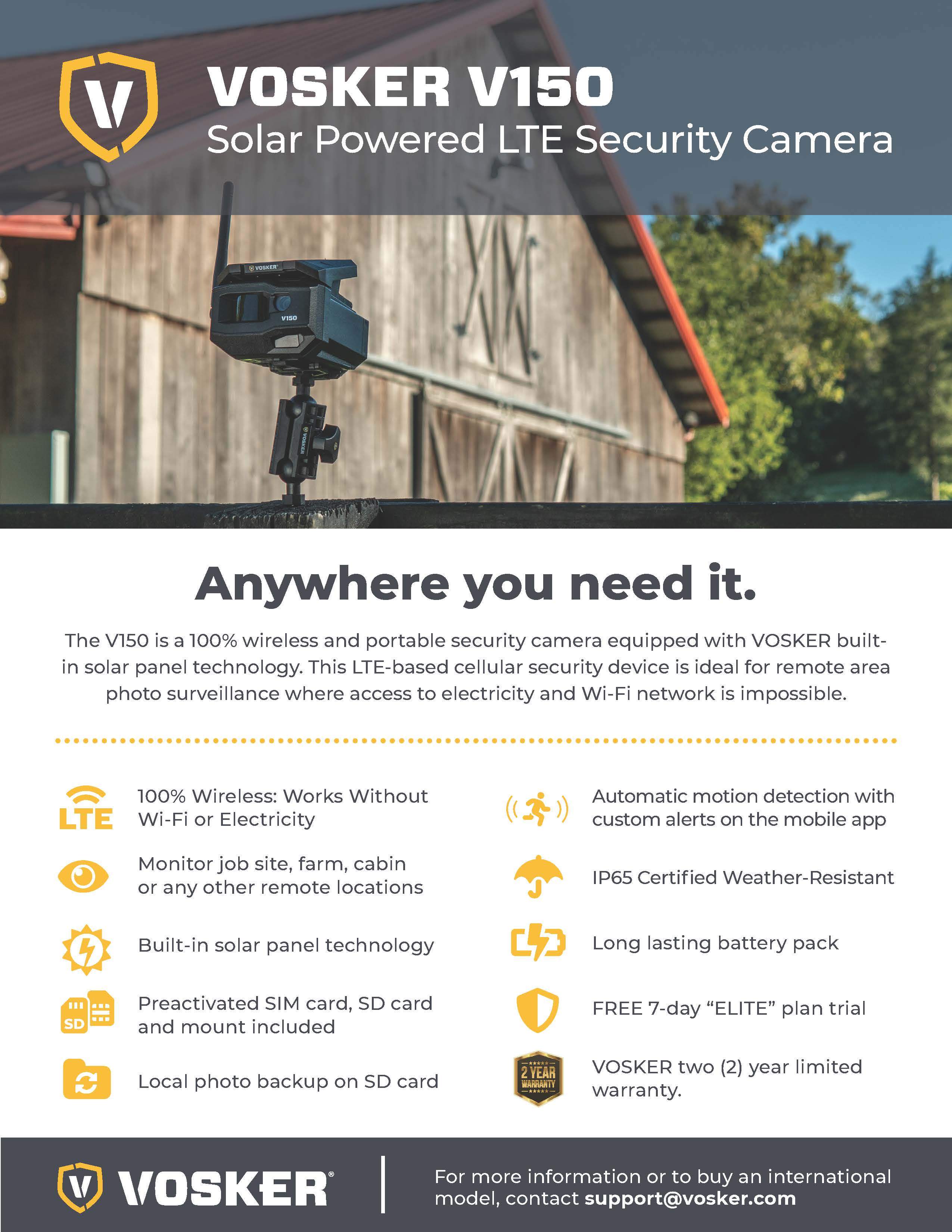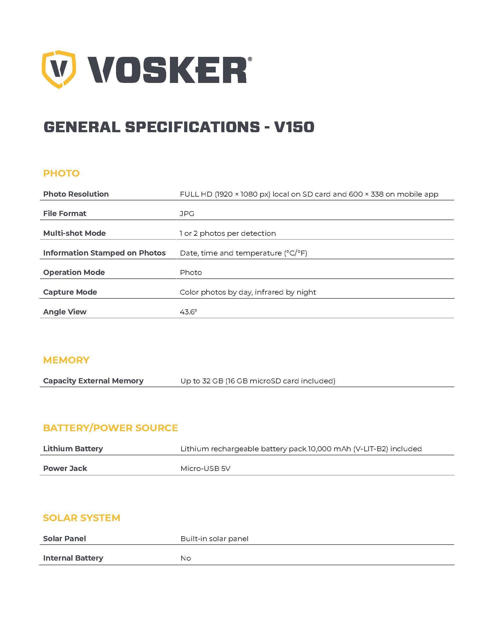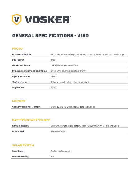 The VOSKER V150 is a 100% wireless and portable security camera equipped with VOSKER built-in solar panel technology & a long lasting 10 000 mAh rechargeable lithium battery. This LTE-based cellular security device is ideal for remote area photo surveillance where access to electricity and Wi-Fi network is impossible. Receive mobile alerts right to your phone and never miss anything again. Set it up easily and let it get to work, anywhere you need it.